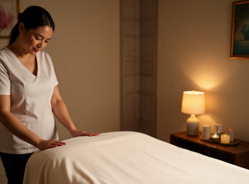 - Preparation: The room is set with dim lighting, soft music, and optional aromatherapy.